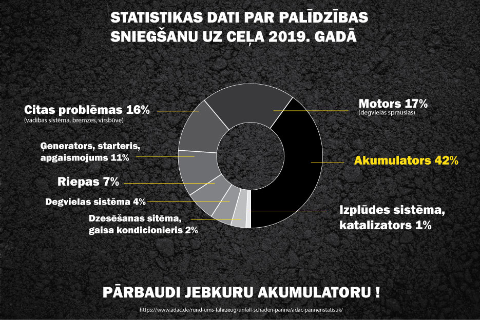 Savā aizņemtajā grafikā, kaut reizi pusgadā, ir vērts pievērst īpašu uzmanību sava auto akumulatoram. Pēc auto evakuācijas dienesta ADAC publicētajiem datiem, varam novērot, ka tieši akumulatoru problēmas ir biežākais iemesls pēc nepieciešamības palīdzībai uz ceļa.