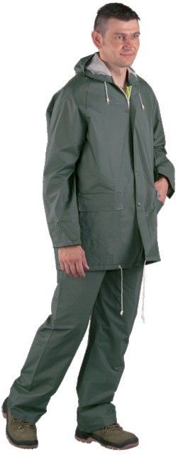 Dubults PVC pārklājums uz kokvilnas / poliestera atbalsta, kas padara šo lietus tērpu ūdensizturīgu.