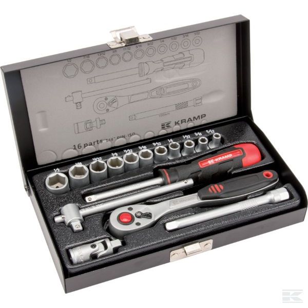 | - Sockets: 5/32", 3/16", 7/32", 1/4", 9/32", 5/16", 11/32", 3/8", 13/32", 7/16" & 1/2" - 75 mm extension - Cardan joint - Handle - T-spanner - 72-teeth ratchet spanner - Metal case |