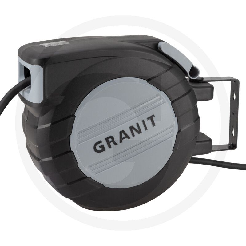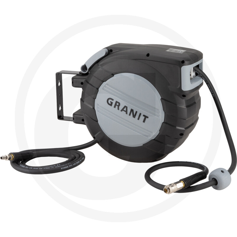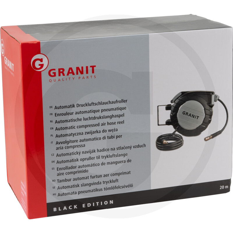 Augstas kvalitātes automātiskais GRANIT BLACK EDITION gaisa šļūtenes ruļļa turētājs ar 20 m garu darba šļūteni un 2 m pieslēguma šļūteni. Izgatavots no elastīga hibrīdpolimēra, kas saglabā elastību arī zemās temperatūrās. Aprīkots ar automātisku palēninātu atvilkšanu, bloķēšanas mehānismu un metāla kronšteinu ar 180° rotāciju ērtai montāžai un lietošanai.