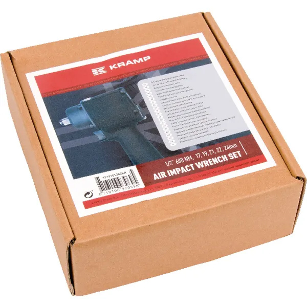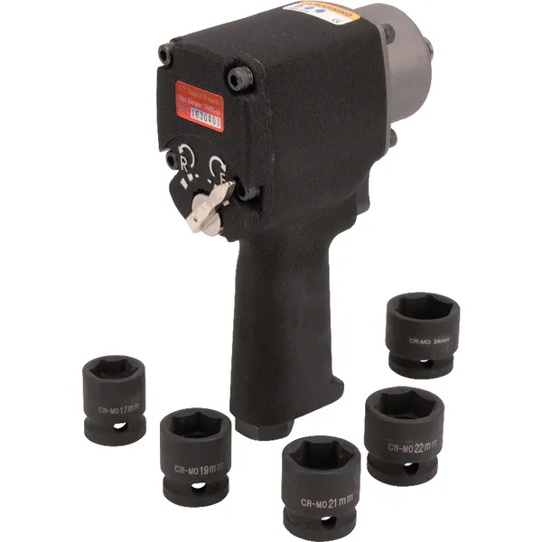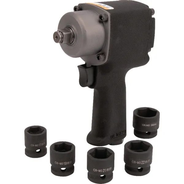 Profesionāla kompakta Kramp pneimatiskā trieciena uzgriežņu atslēga, 1/2 collu piedziņa, ietver 5 gabalu mini trieciena uzmavas komplektu.