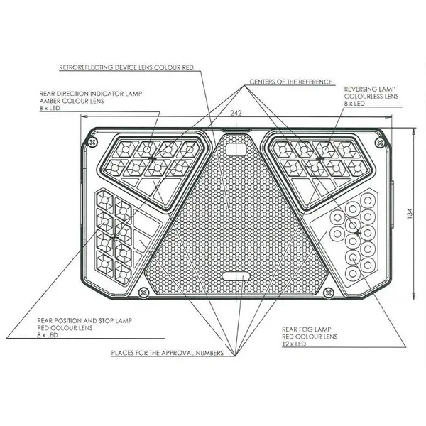Funkcijas: aizmugures lukturis, virziena rādītājs, pozīcijas gaisma, bremžu gaisma, miglas gaismas, reversā gaisma, atstarojošā gaisma