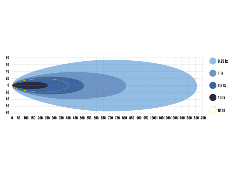 Maksimāla gaismas jauda un attālums – līdz 816 metriem (1 lux)
