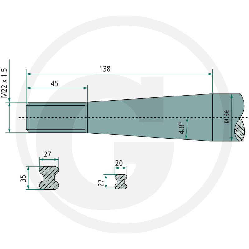 Izliekts pīķis M22 x 1,5 mm, kvadrātveida, konuss K002