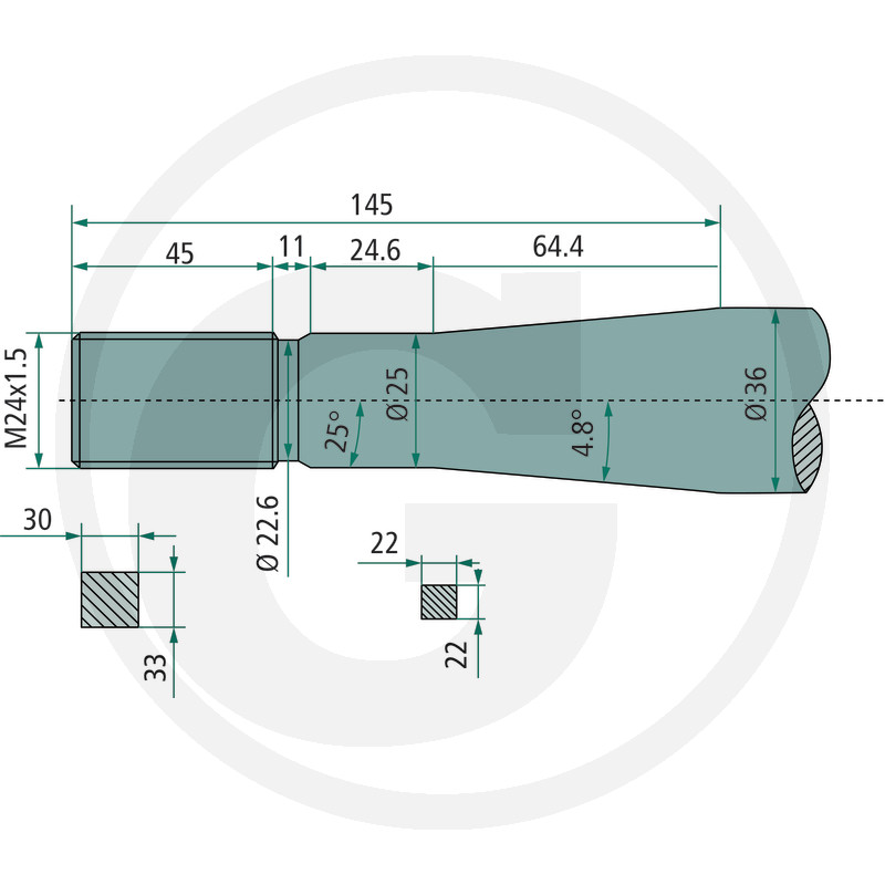 Izliekts pīķis, M22 x 1,5 mm, kvadrātveida, konuss K111