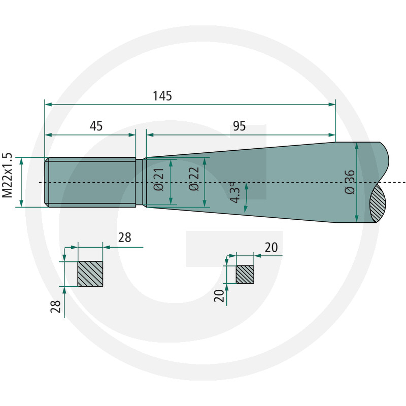 Izliekts pīķis, M22 x 1,5 mm, kvadrātveida, konuss K128
