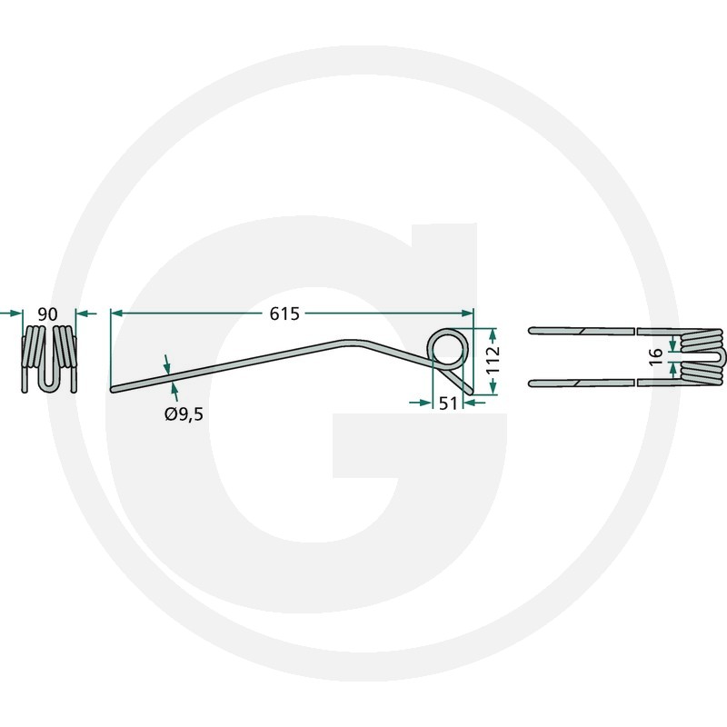 Rotējošā grābekļa zars, 615x90 Ø9,5 mm