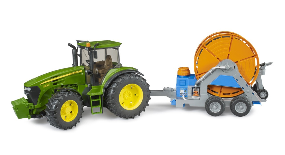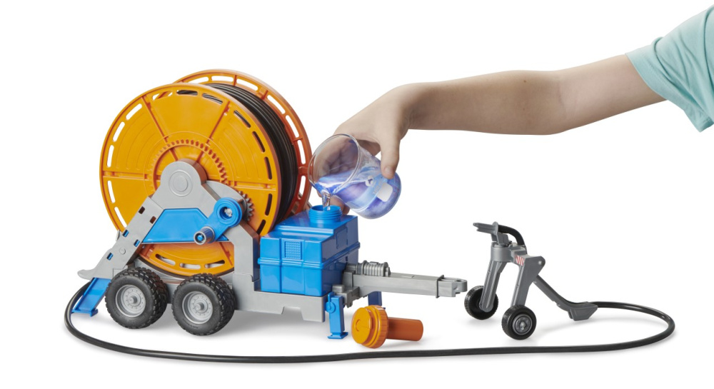 Bērni var ar kloķi izvilkt 1,8 metru garu šļūteni, pie kuras ir piestiprināts precīzi detalizēts laistīšanas traktors. Saskaņā ar BRUDER moto “Gluži kā īstajā dzīvē”, modelī ir iekļauta tvertne ar funkcionējošu sūkni, kas ļauj realistiski izkliedēt ūdeni. Šī aizraujošā piekabe ir savietojama ar visiem BRUDER lauksaimniecības traktoriem.