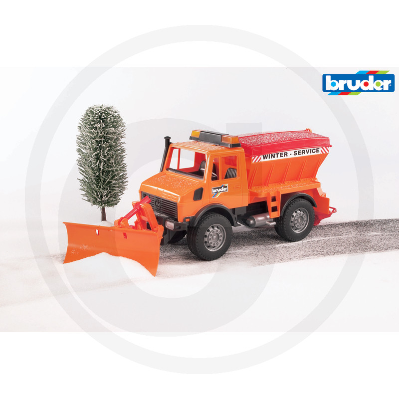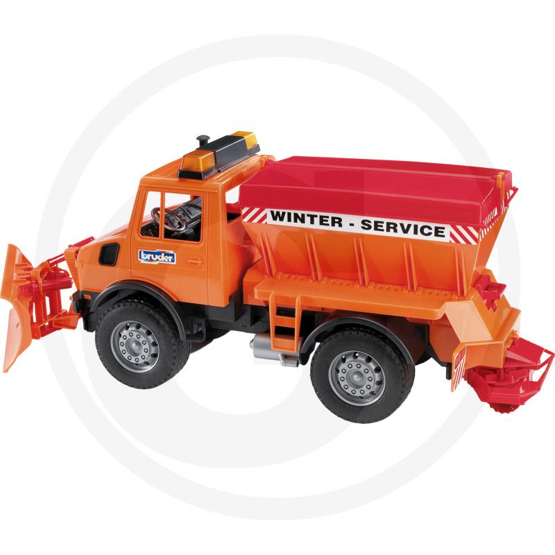 MB Unimog ziemas servisa sniega tīrītāja asmens ir pārvietojams un nolaižams. Tvertnes vāku var atvērt un tvertni piepildīt un aizvērt, darbinot aizbīdni. Izkliedētājs ir pilnībā funkcionāls. Protektorētas riepas.
