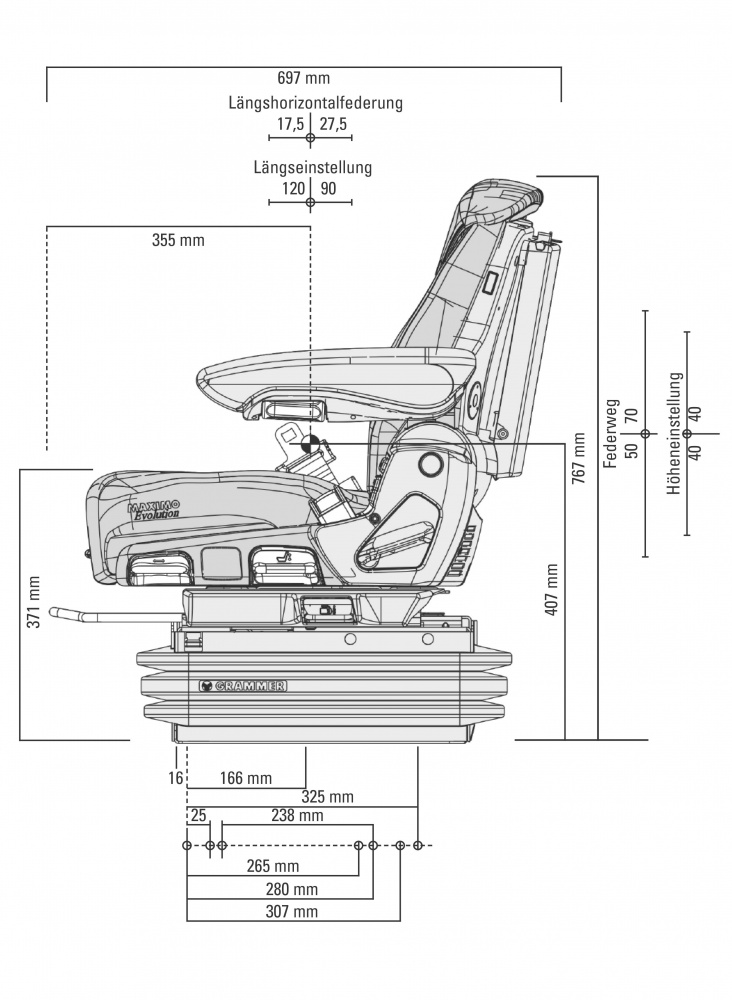 Maximo Evolution Professional traktora sēdekļi ir speciāli izstrādāti riteņtraktoriem ar kabīnes amortizāciju, jo to svārstību amplitūda un biežums ir mazāks. Tieši tādēļ GRAMMER ir izstrādājis zemu-frekvenču balstiekārtu. Tas lieliski absorbē vertikālās vibrācijas un grūdienus, tādējādi pasargājot operatoru muguru no nepārtrauktu svārstību izraisītām sekām, kā arī braucienu padara komfortablāku.